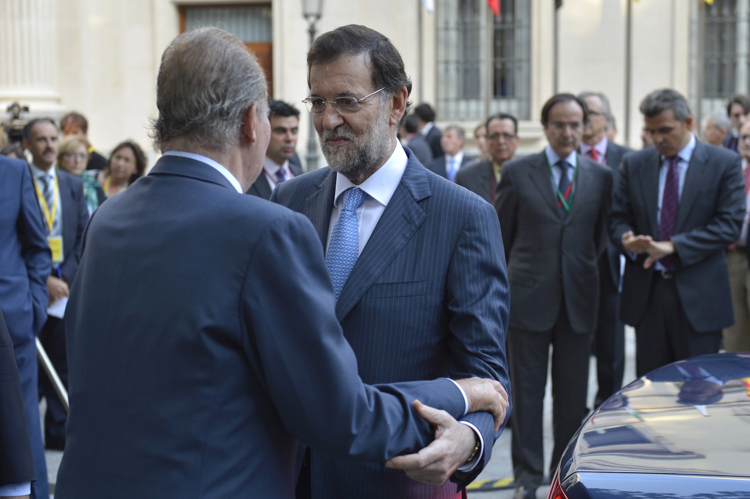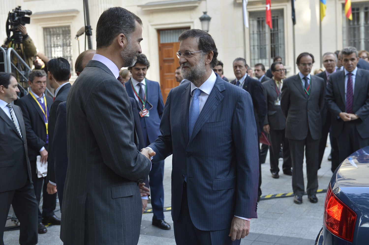 El Príncipe Felipe y Rajoy se estrechan la mano, ante la fija mirada de Jorge Moragas, al fondo