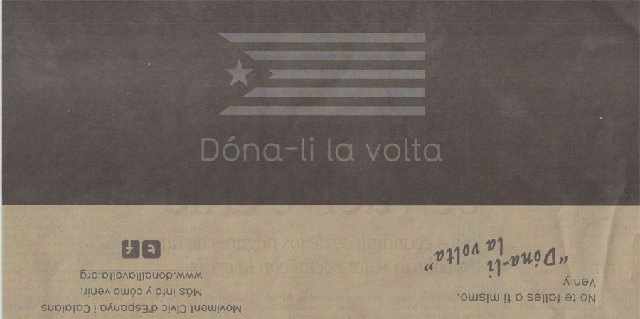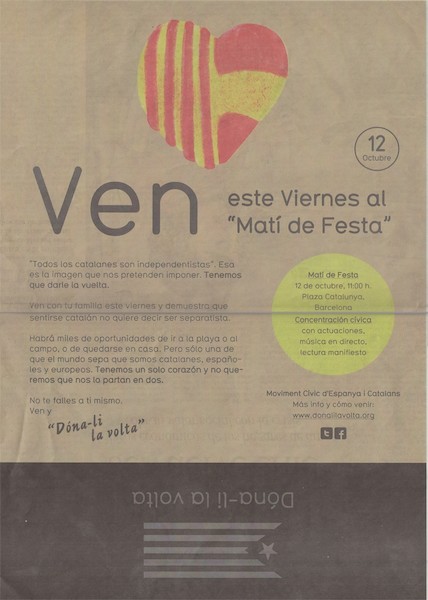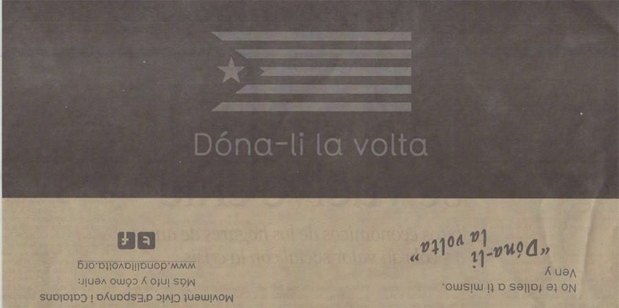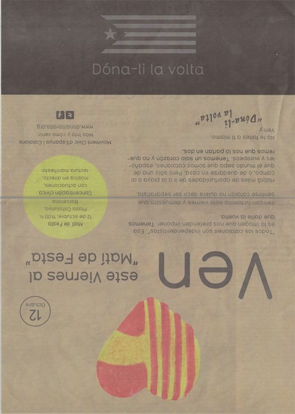 El anuncio a toda página es llamativo. Bajo una señera en blanco y negro y el lema "dale la vuelta", aparece el cartel, escrito al revés, con la convocatoria para la concentración en Barcelona contra los movimientos independentistas en Cataluña y por la unidad de España.