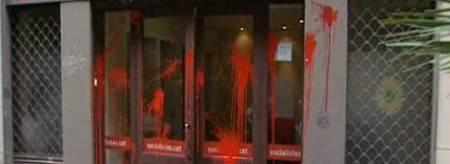 Diez personas con la cara cubierta y vestidos con colores oscuros se han presentado en el exterior de la sede, y cuatro de ellas han tirado piedras y pintura contra la fachada, donde también han pintado una estelada -símbolo independentista- y han escrito la palabra "culpables".