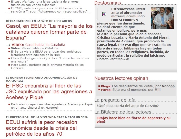 Tal día como hoy, 17 de octubre, pero de 2008, Libertad Digital reproducía en su portada las declaraciones de Pau Gasol en una entrevista concedida a la página web de Los Ángeles Lakers. Titulaba "Gasol, en EEUU: "La mayoría de los catalanes quiere formar parte de España".