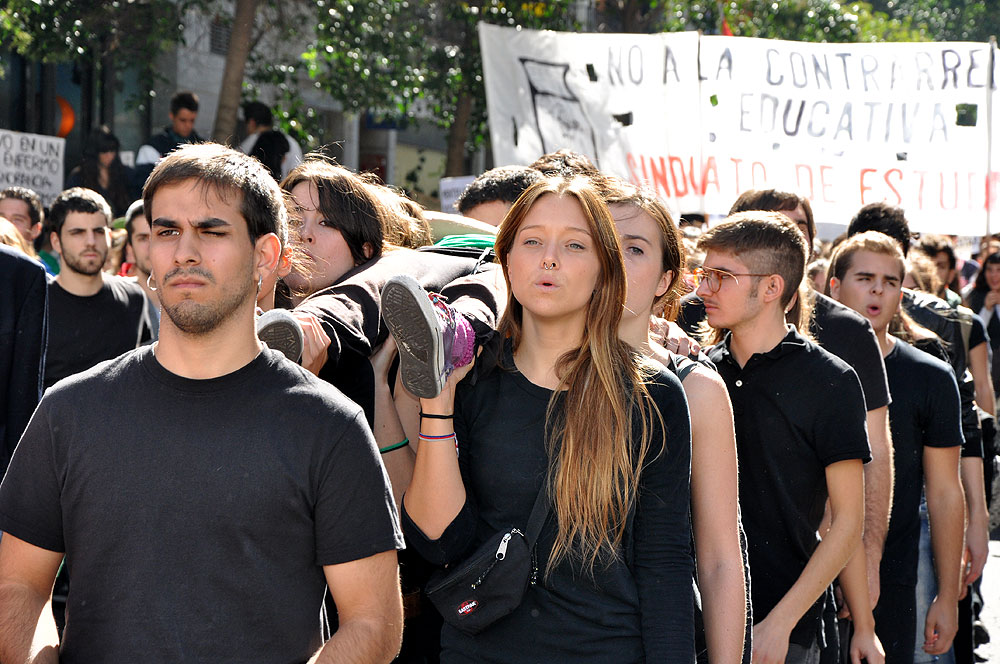 Varios jóvenes portan pancartas contra el Gobierno y contra Wert, en una de ellas escriben "exclavitud".