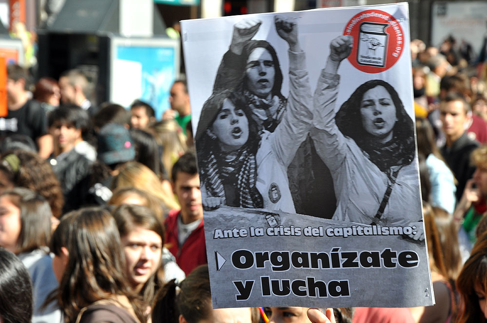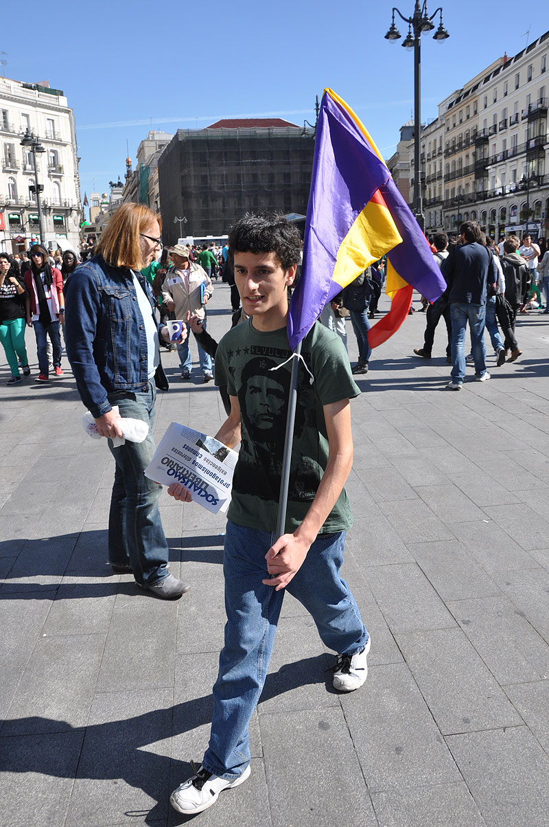 Un joven con una bandera republicana, la camiseta del Che y un panfleto socialista.
