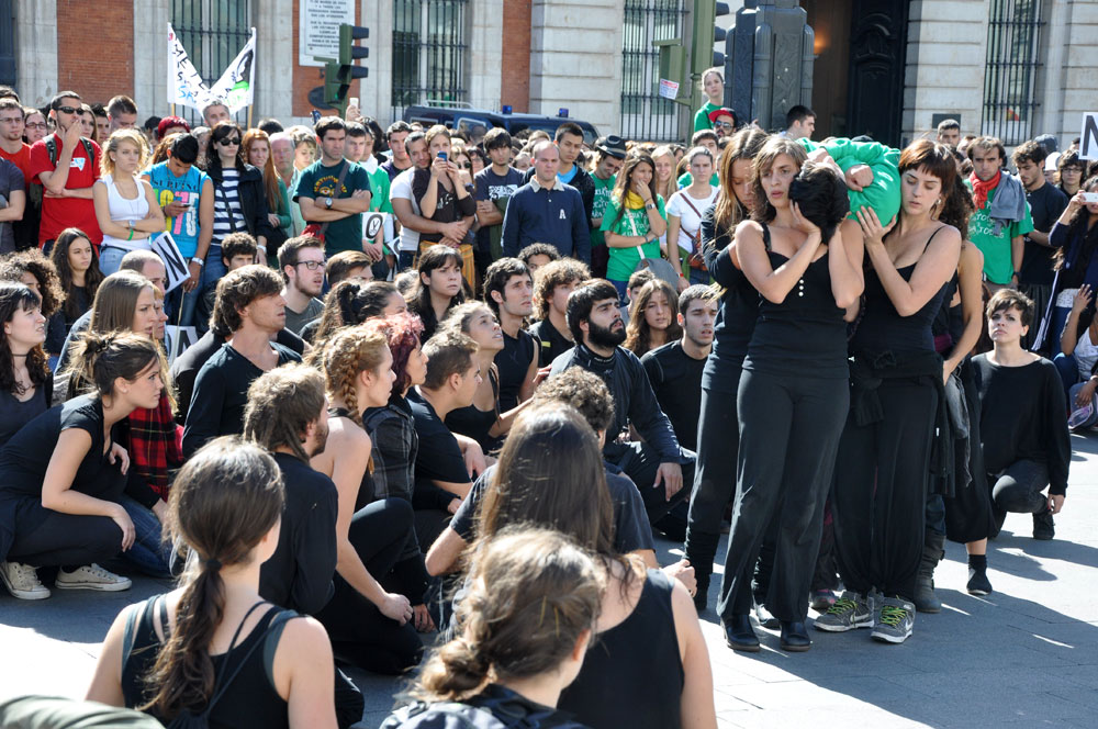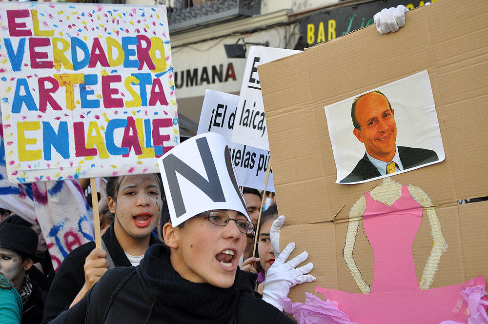 La figura del ministro Wert no faltó en la manifestación estudiantíl. En esta ocasión su foto fue colocada cuidadósamente en el dibujo del cuerpo de una bailarina.