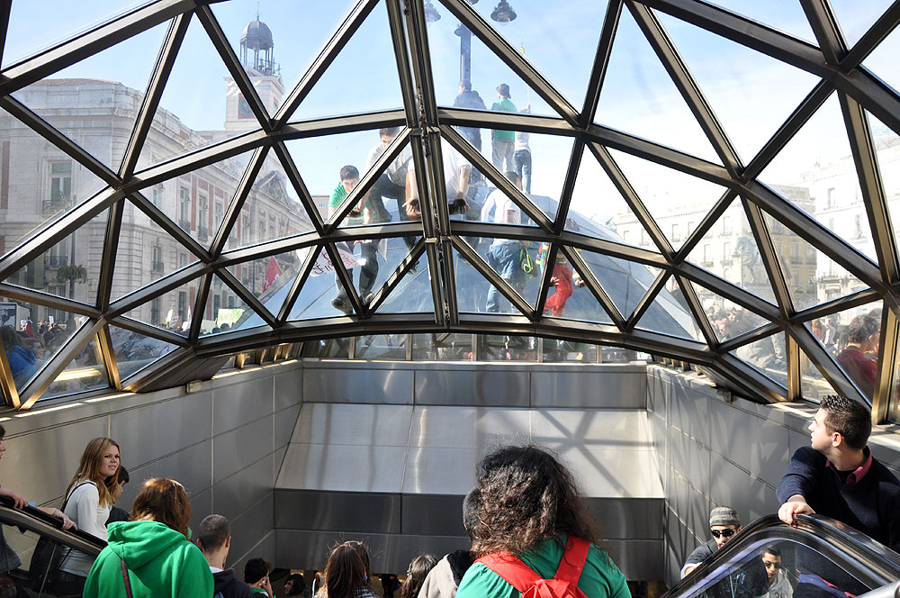 En la cúpula de la entrada del metro algunos de los manifestantes lograron encaramarse sobre la estructura.