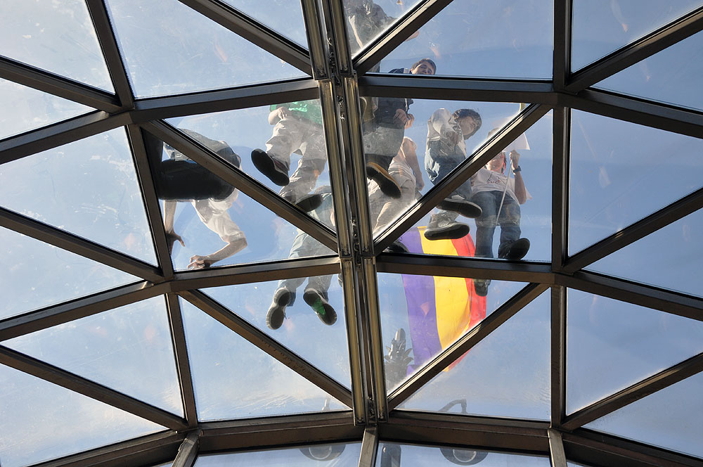 Ocho personas, portando la bandera republicana, sobre la cristalera.