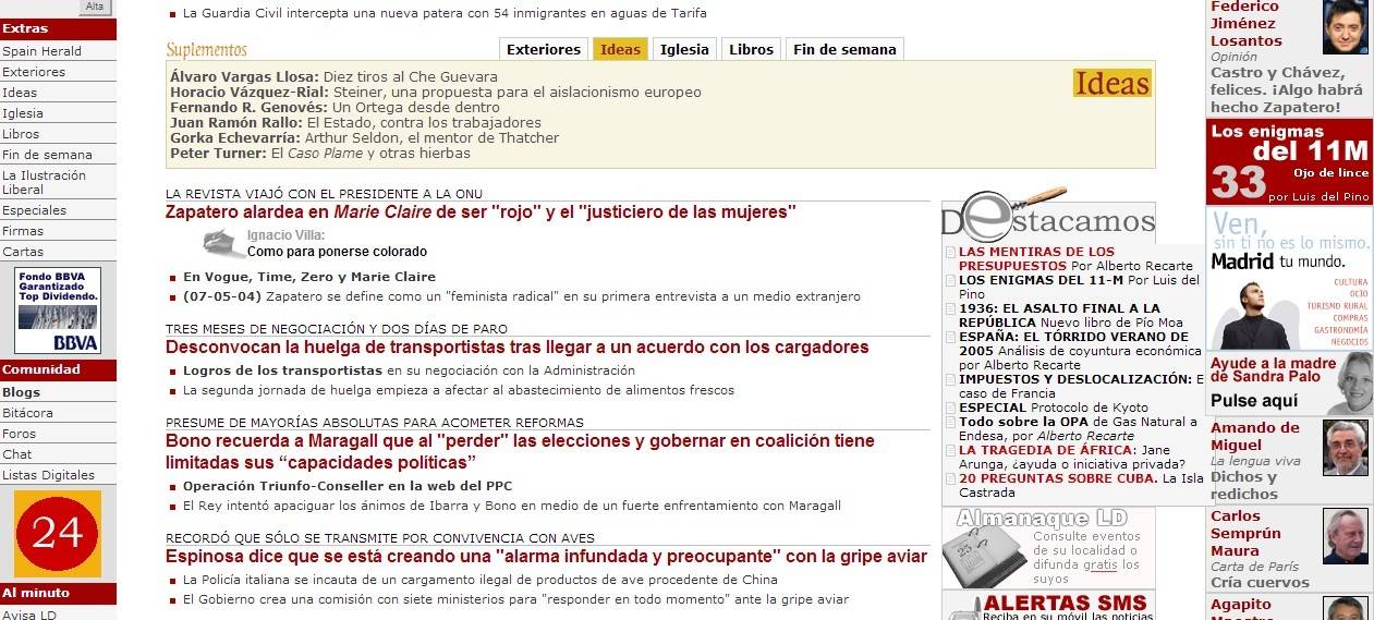 Tal día como hoy, 18 de octubre, pero de 2005, Libertad Digital llevaba en su portada lo más destacado de una entrevista al presidente del Gobierno realizada por una revista femenina de alta gama: "Zapatero alardea en Marie Claire de ser "rojo" y el "justiciero de las mujeres". Esta publicación le siguió durante su viaje a Estados Unidos con motivo del 60 aniversario de la ONU.