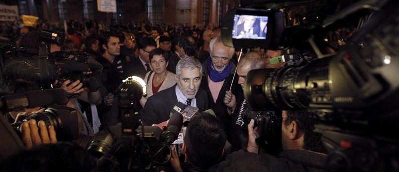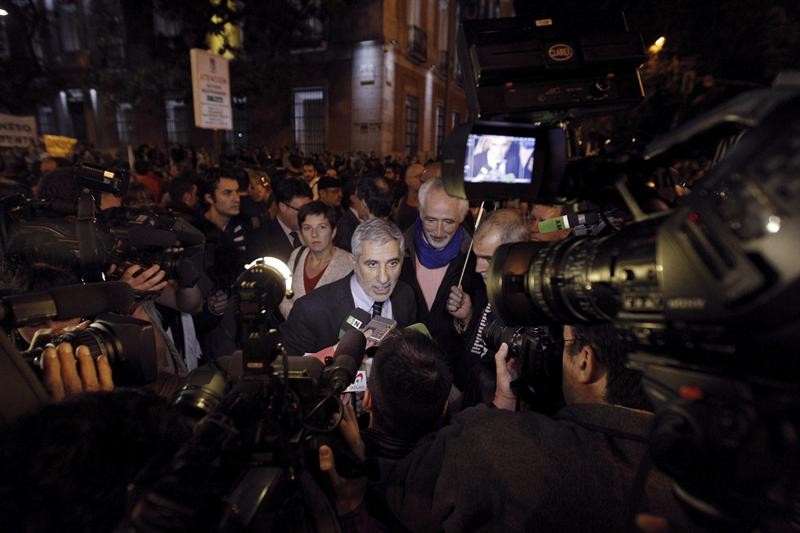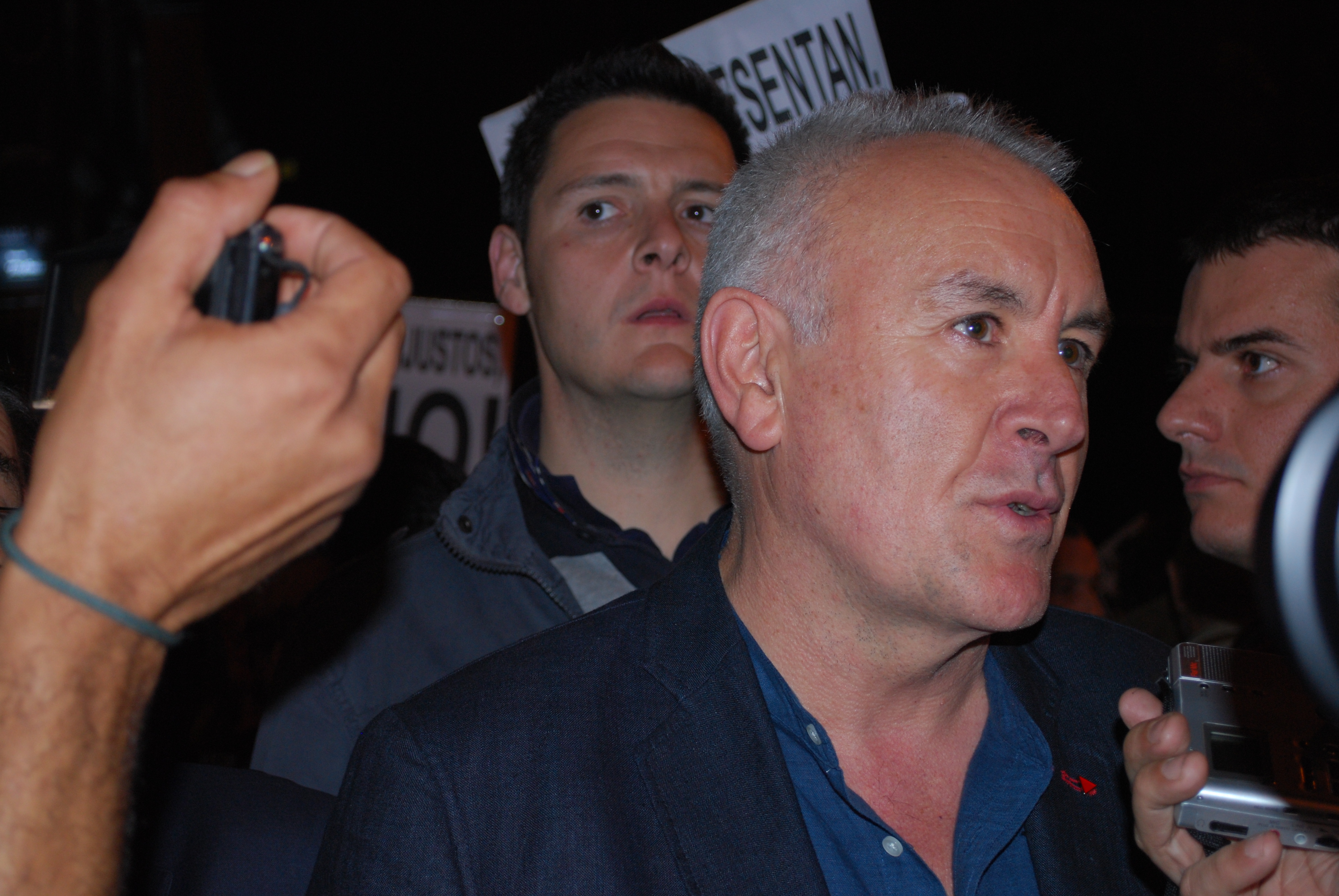 Cayo Lara, líder de IU, rodeado de cámaras y también de carteles, tras él, con el lema "No nos representan"