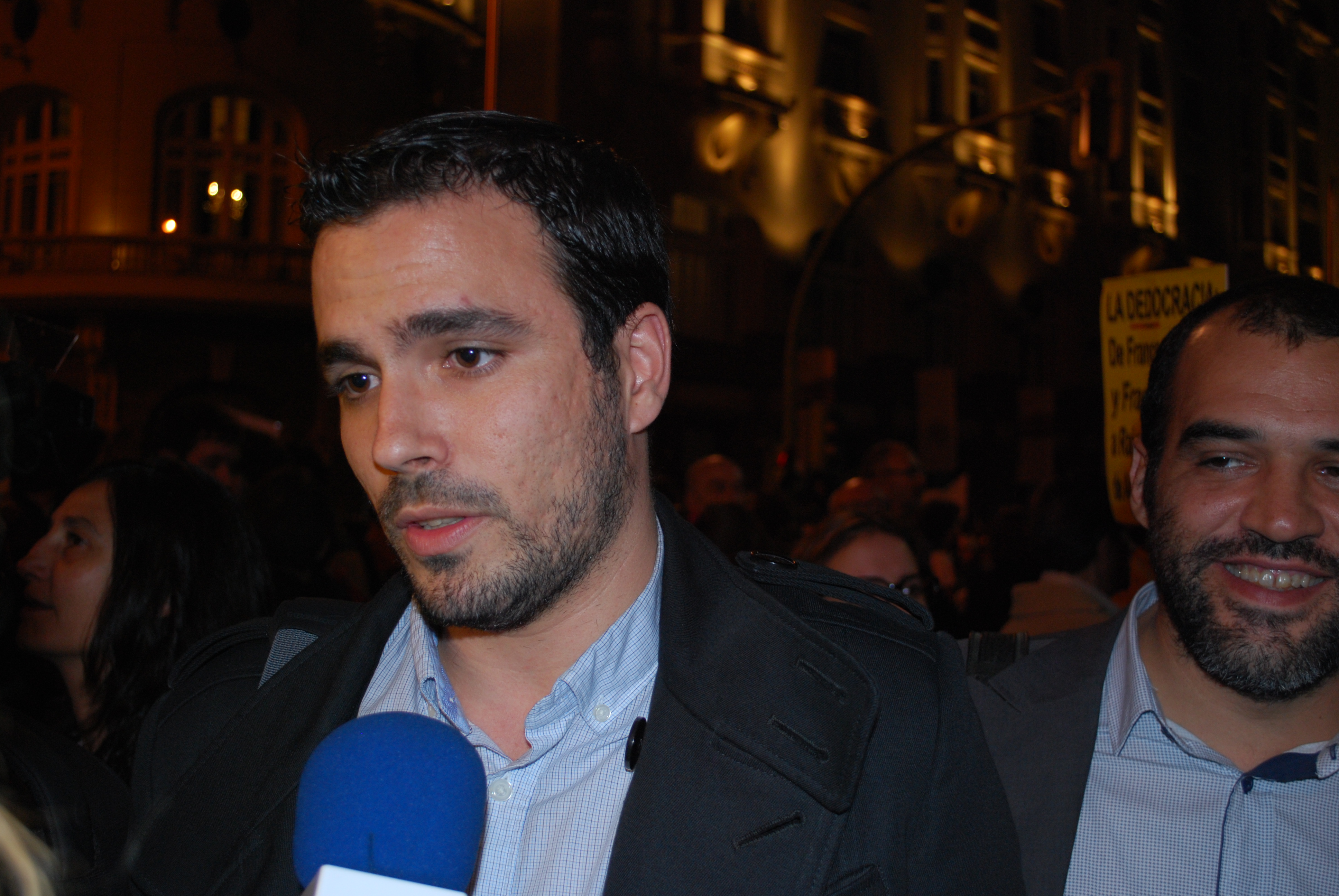 Alberto Garzón, diputado de IU, atendiendo a los medios junto a los manifestantes