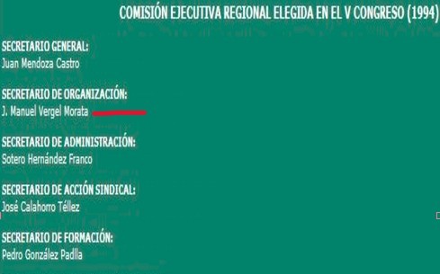 Pero es más. Vergel es ugetista de toda la vida e incluso fue secretario de organización de la UGT de Andalucía elegido en el V Congreso de 1994. El documento que sigue es incuestionable: