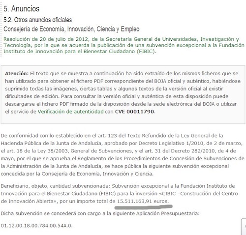 Aunque la ayuda del gobierno Griñán fue concedida en enero, aparece en el BOJA en una resolución de 20 de julio de 2012, que pueden ver a continuación: