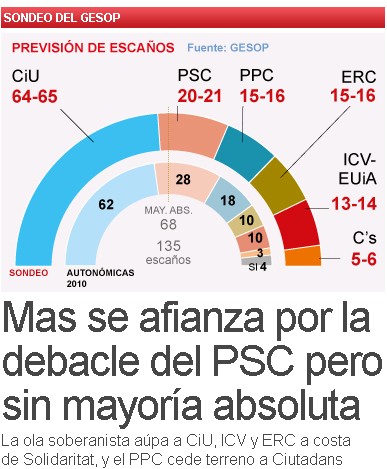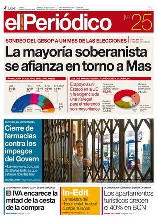 El Periódico de Cataluña lleva este jueves a su portada un sondeo electoral del GESOP (Gabinete de Estudios Sociales y Opinión Pública) que da como vencedor de las próximas elecciones en esta autonomía española a Artur Mas. El diario titula la información "La mayoría soberanista se afianza en torno a Mas", pese a que el sondeo no le da la mayoría absoluta al líder de CiU.