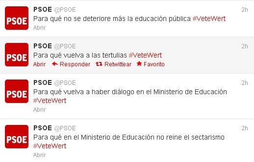 El PSOE ha estado muy activo en la red social Twitter mientras su número dos, Elena Valenciano, defendía en la tribuna del Congreso la reprobación que han presentado contra el ministro de Educación, José Ignacio Wert.