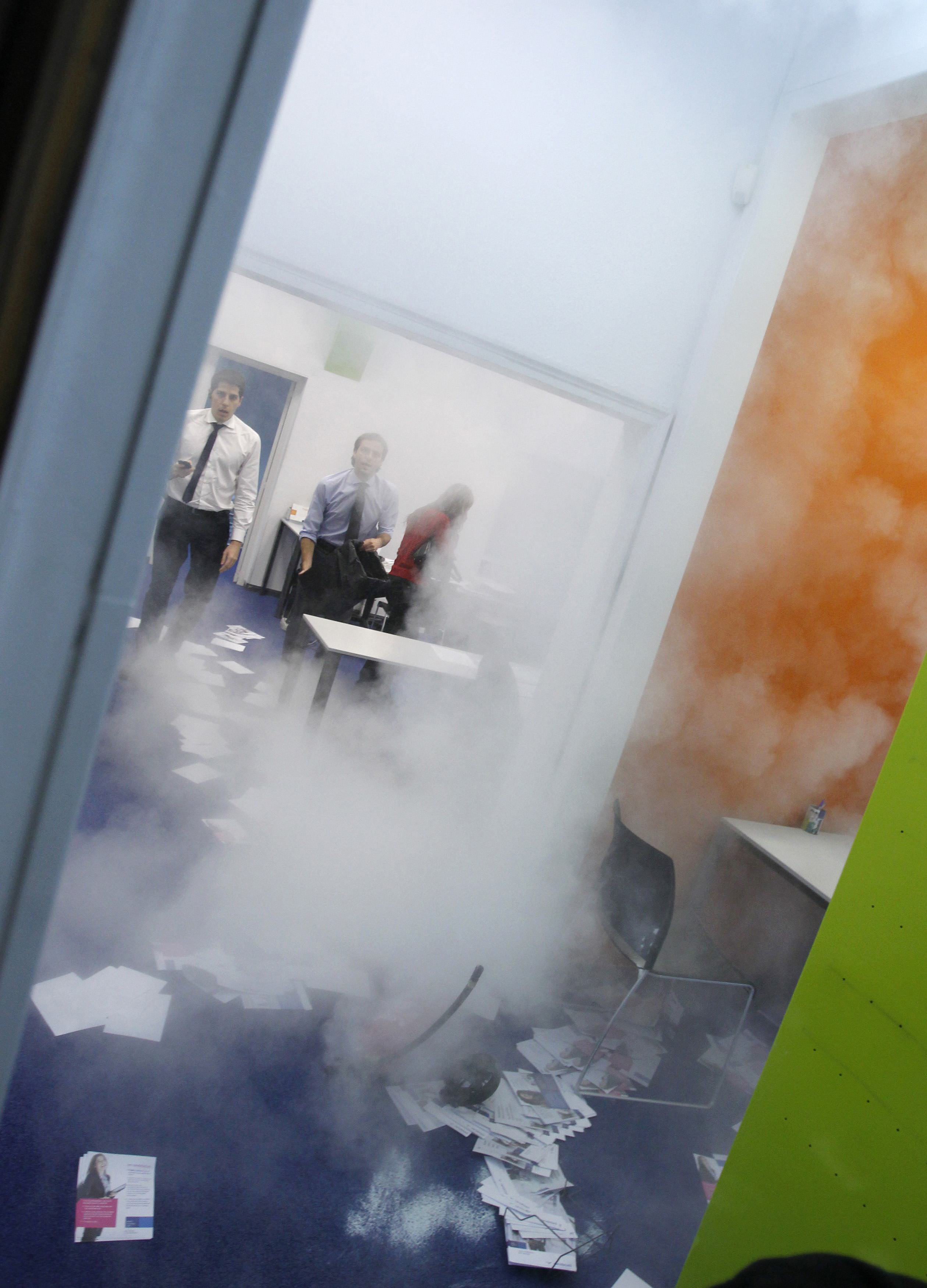 Sindicalistas usan un extintor en una empresa de trabajo temporal de Barcelona