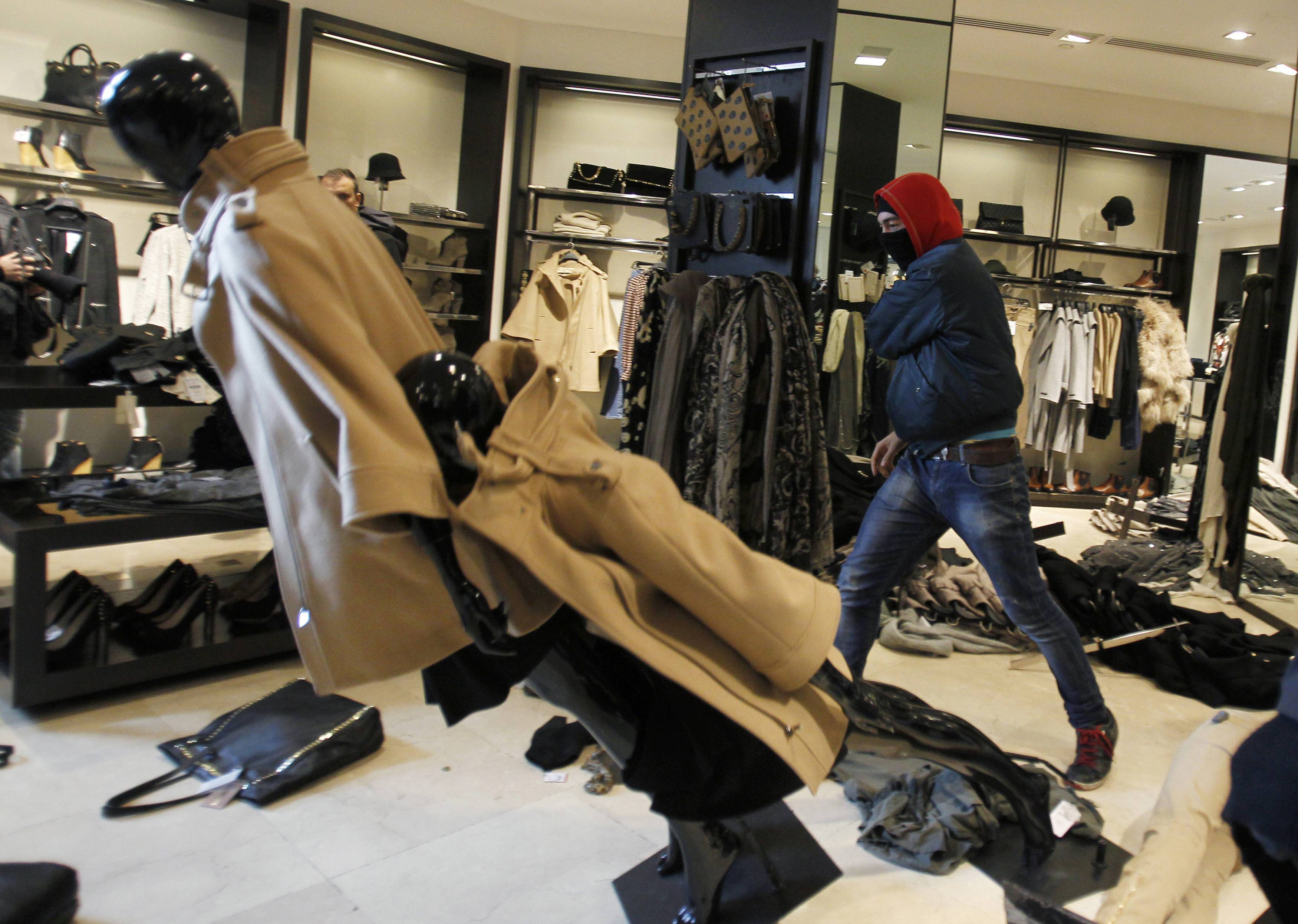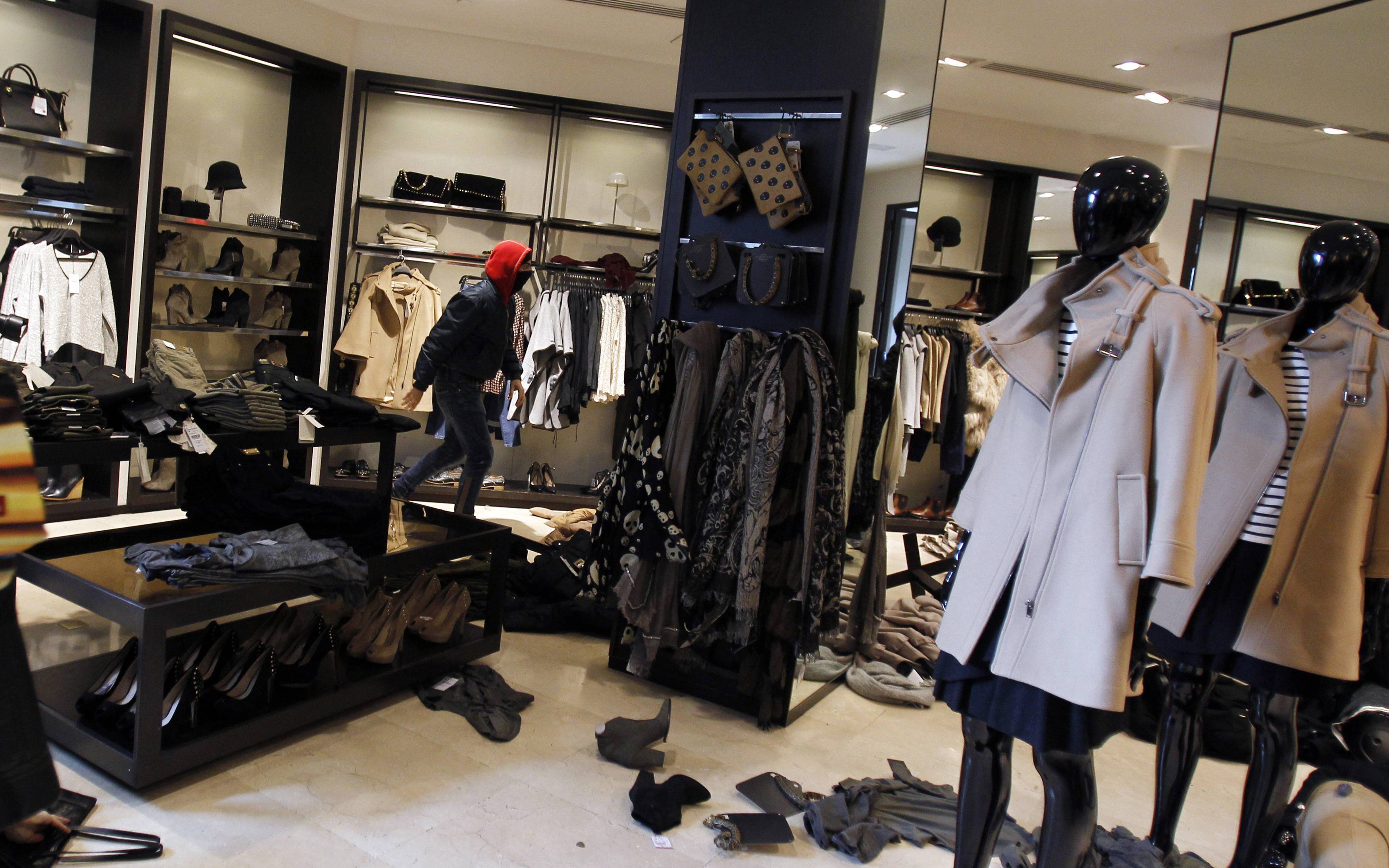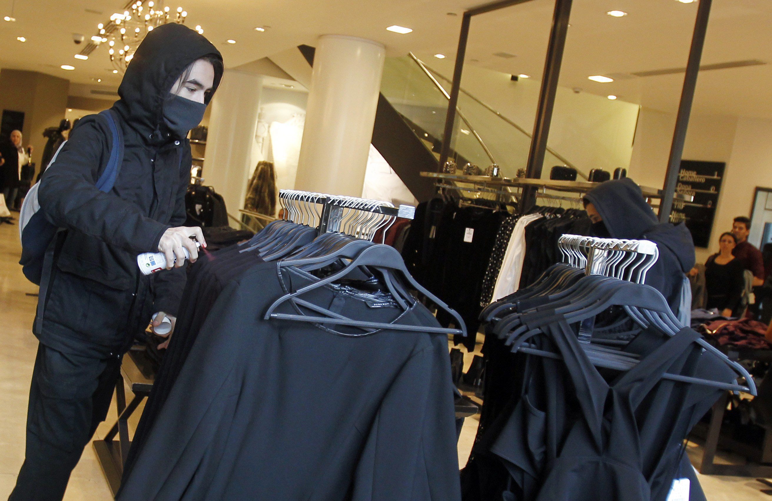 Uno de los asaltantes rociando con spray las prendas de ropa de Zara