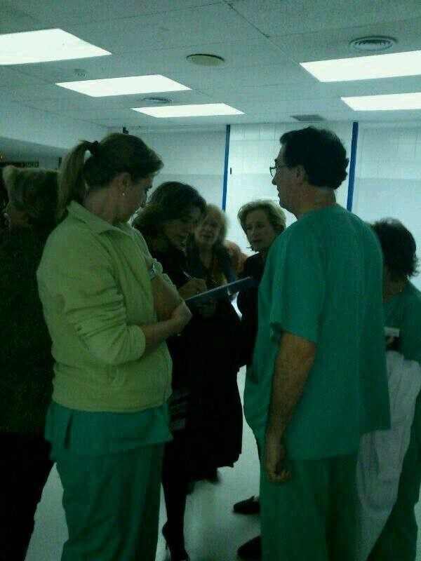 Una vez en el centro, Botella fue requerida por un grupo de empleados que le explicaron su postura contraria a la transformación del Hospital y le pidieron que firmase el documento de adhesión a la protesta, que ya ha reunido más de 100.000 firmas, según los trabajadores.