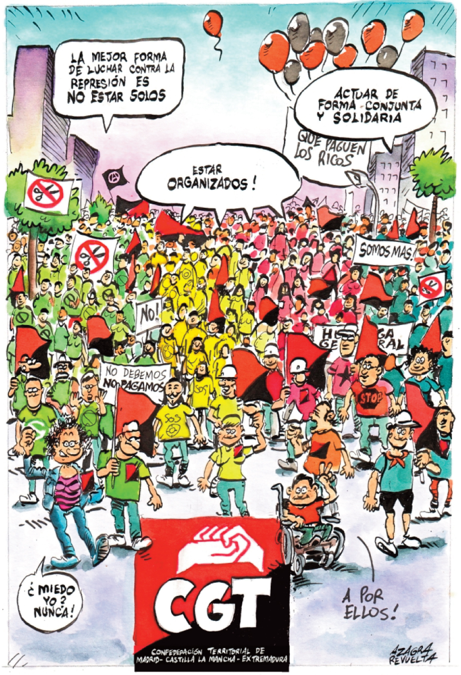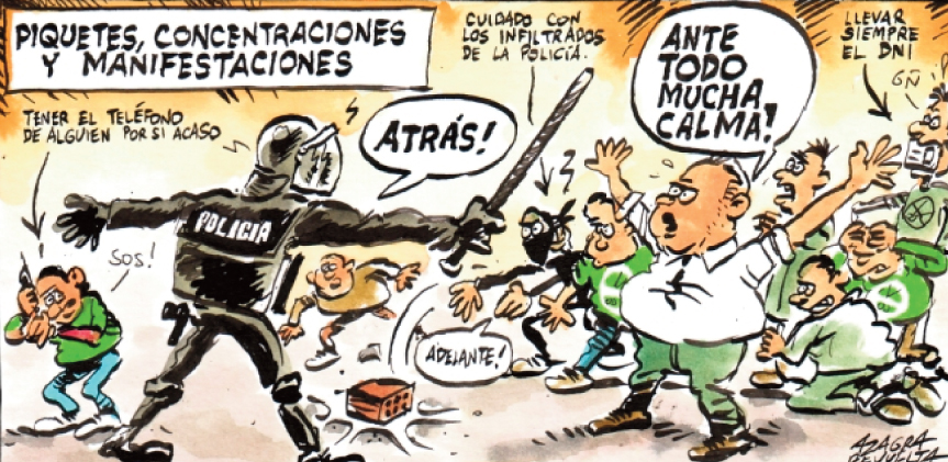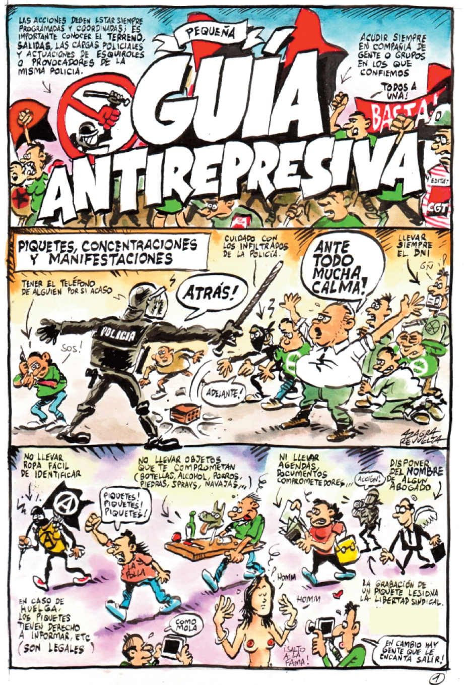 En la portada de la Guía, el sindicato muestra a un agente de la UIP frente a un grupo de manifestantes. En la segunda viñeta también vemos una caricatura de un agente de paisano. Además, CGT pide a los manifestantes que no lleven objetos que comprometan -"botellas, alcohol, porros, piedras, sprays, navajas"- y que se camuflen, no llevando "ropa fácil de identificar", así como "agendas" y "documentos comprometedores".