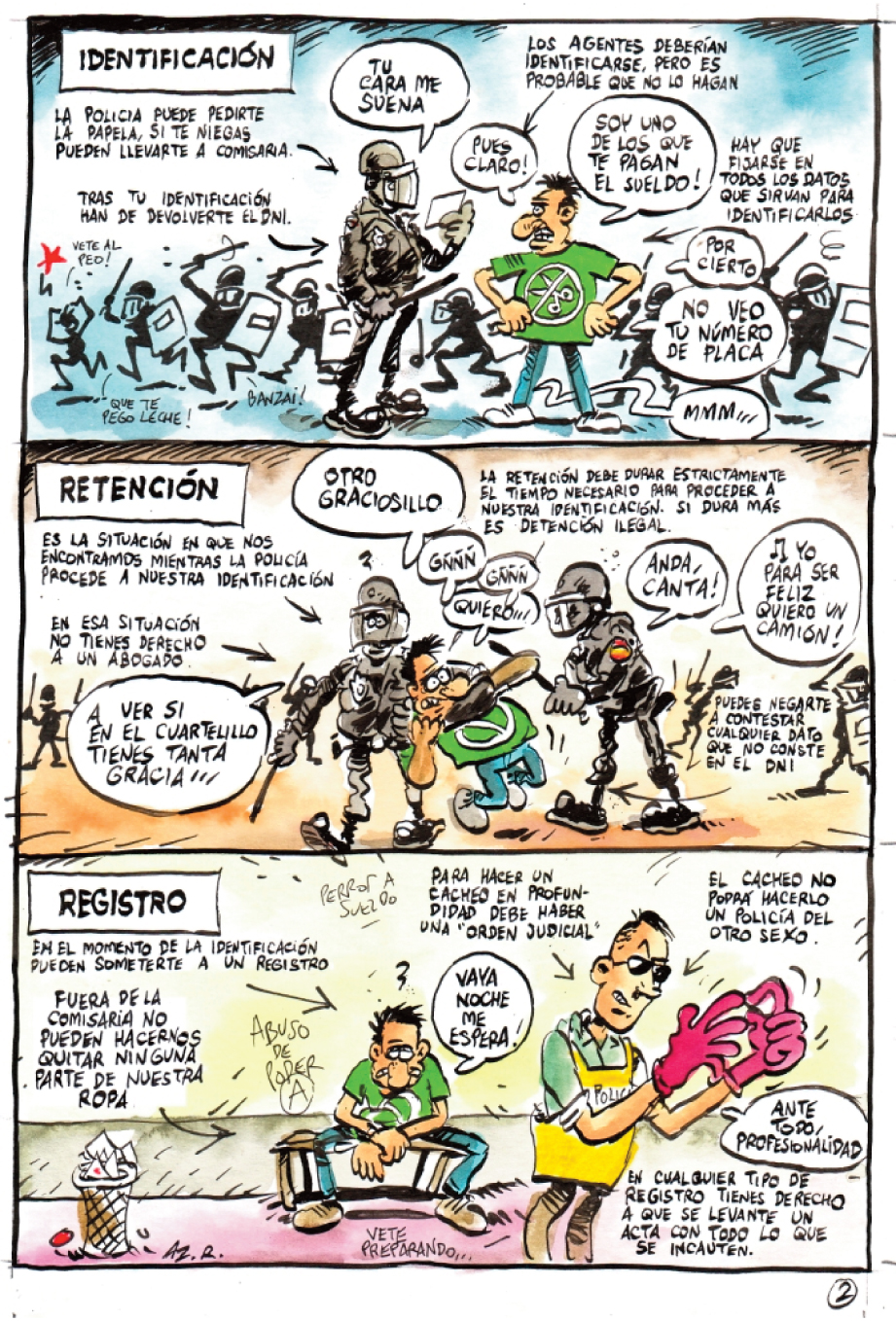 En la segunda hoja, el sindicato explica a su manera qué es una identificación, una retención y un registro policial. En la primera viñeta vemos a un antidisturbios entrevistando a un manifestante, que porta una camiseta verde. El agente le dice al tipo: "Tu cara me suena". El otro, responde: "Soy uno de los que te pagan el sueldo". En la viñeta del medio, un agente de la UIP agarra del cuello a un manifestante, mientras que otro le anima a que cante "Yo para ser feliz quiero un camión". En la tercera, el policía dibujado recuerda a Hitler.