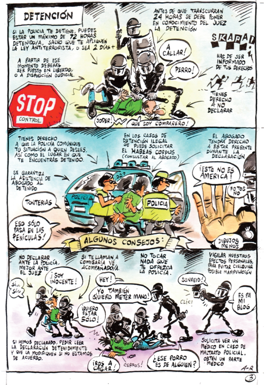 La tercera página está dedicada a la 'fase' de detención. En la primera viñeta, la CGT recuerda lo ocurrido el 25-S, cuando un grupo de antidisturbios confundieron a un agente de paisano y lo inmovilizaron en el suelo. En la última, un agente pregunta si un porro que aparece en el suelo es de alguien, mientras que otro está haciendo fotografías y diciendo "sonreid" y "es pa mi blog".