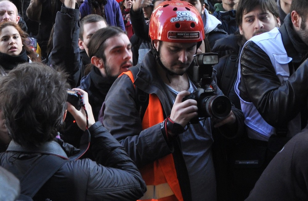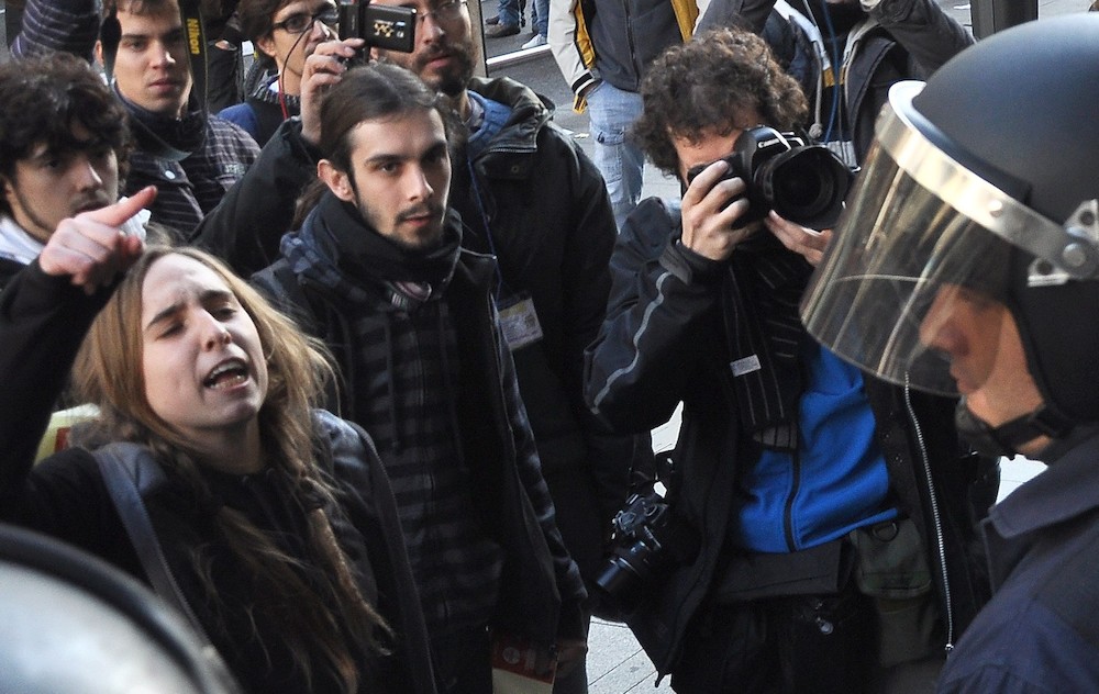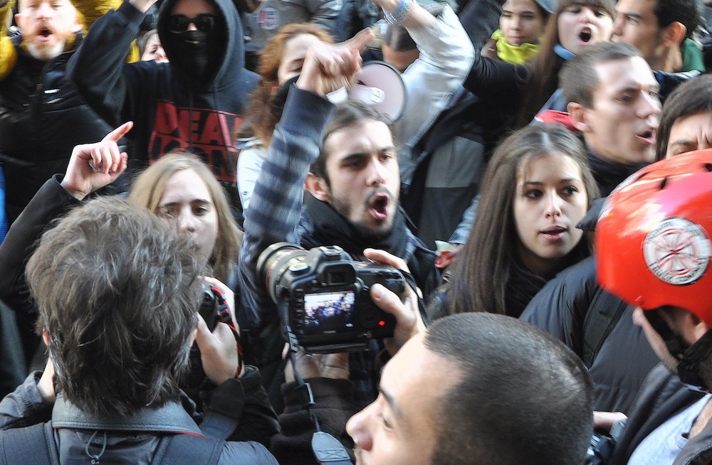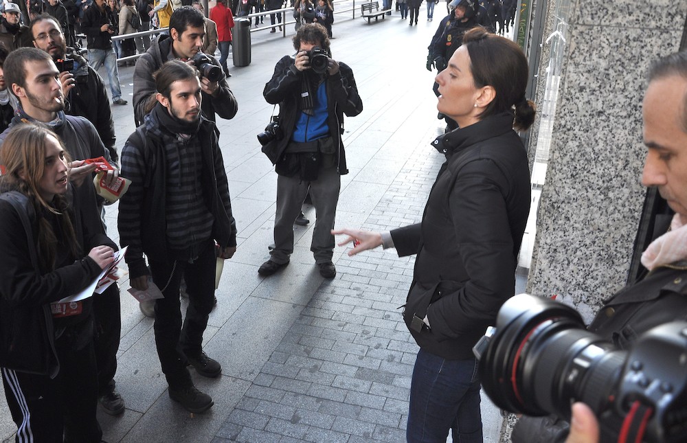 Junto a fotógrafos y otros piquetes mientras increpaban a la responsable del local.