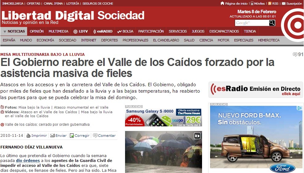 Tal día como hoy, 14 de noviembre, pero de 2010, Libertad Digital llevaba en su portada que "El Gobierno reabre el Valle de los Caídos forzado por la asistencia masiva de fieles". Una semana después de que el Ejecutivo de Zapatero diera órdenes a la Guardia Civil de impedir el acceso al lugar, la Misa de ese día se convirtió entre una de las más concurridas en el más de medio siglo de historia de la Abadía de la Santa Cruz. A pesar de que era una mañana fría y lluviosa, entre 6.000 y 8.000 personas colapsaron la carretera de El Escorial desde la A-6 para acceder al templo.