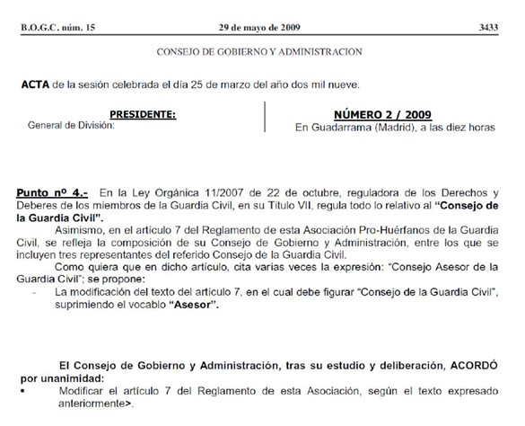 Como prueba de ello, entregan a la magistrada un extracto del Boletín Oficial de la Guardia Civil del 29 de mayo de 2009 –un mes después de la llegada de Velázquez al cargo– en el que se da fe de la modificación de los estatutos de la asociación para dar entrada a los representantes del Consejo. Una modificación que también se añade en la copia de los estatutos que figura en la propia página web de la Asociación Pro-huérfanos.