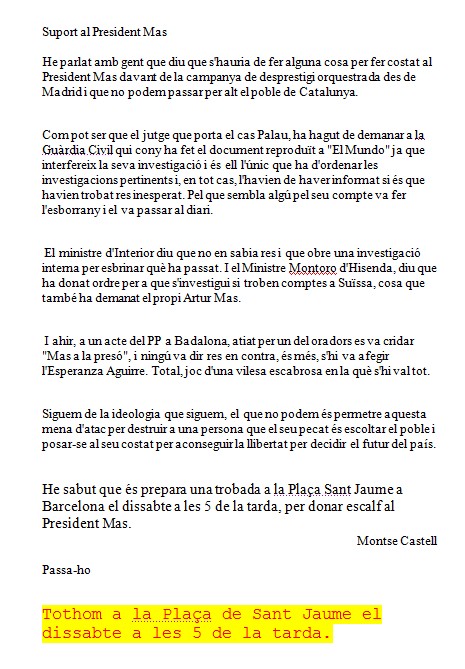 Sin mencionar de qué modo se está convocando dicha manifestación, ni a través de qué redes se difunde, La Vanguardia se apoya en un documento que adjunta en su información cuya autoría queda defendida por la firma de una tal "Montse Castell", pero nada más. Se trata, según La Vanguardia, de una carta de una ciudadana cualquiera remitida al periódico. Pese a que se dice que la autora de la carta es la convocante, en la carta leemos que "he sabido que se prepara un encuentro en la Plaza de San Jaime de Barcelona el sábado a las 5 de la tarde para arropar a Artur Mas". Deja claro, por lo tanto, que no es el origen de la convocatoria.