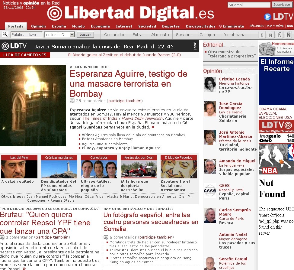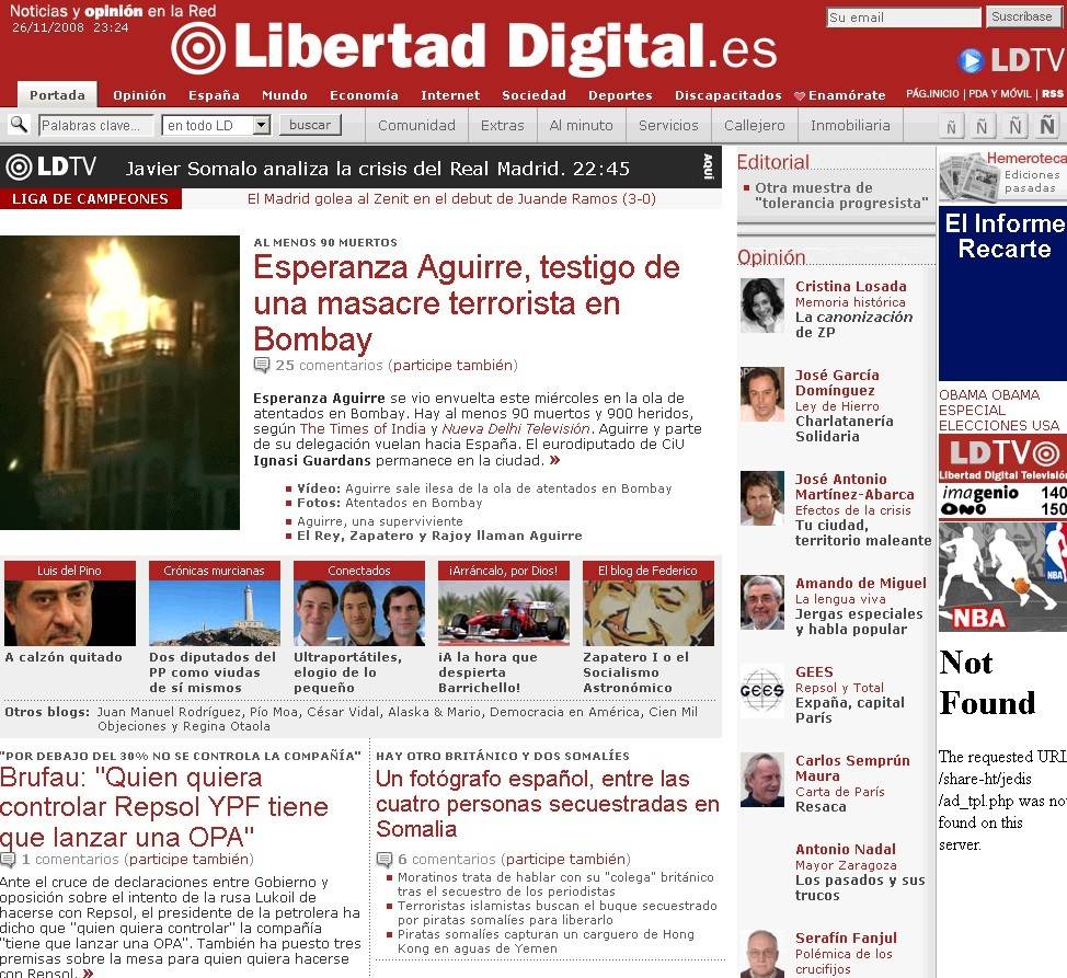 Tal día como hoy, 26 de noviembre, pero de 2008, Libertad Digital contaba en su portada el atentado en Bombay que provocó casi 200 muertos y más de 300 heridos titulando que "Esperanza Aguirre sale ilesa de una masacre terrorista en Bombay". La presidenta de la Comunidad de Madrid fue testigo de los atentados al encontrarse en la recepción de uno de los hoteles atacados. Tanto ella como políticos y empresarios, que formaban parte de la delegación madrileña en la ciudad, se vieron sorprendidos por un tiroteo en el hotel Oberoy y consiguieron ponerse a salvo y salir de la zona para regresar a España.