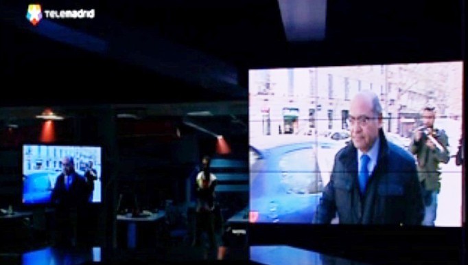 A partir de las 00:03 y tras unos minutos de publicidad, Telemadrid ha emitido una imagen del plató de informativos con iluminación tenue, donde se pueden ver dos fotos de distinto tamaño del ex presidente de la CEOE Gerardo Díaz Ferrán, detenido el lunes, y a empleados de la emisora que se encuentran en el plató.