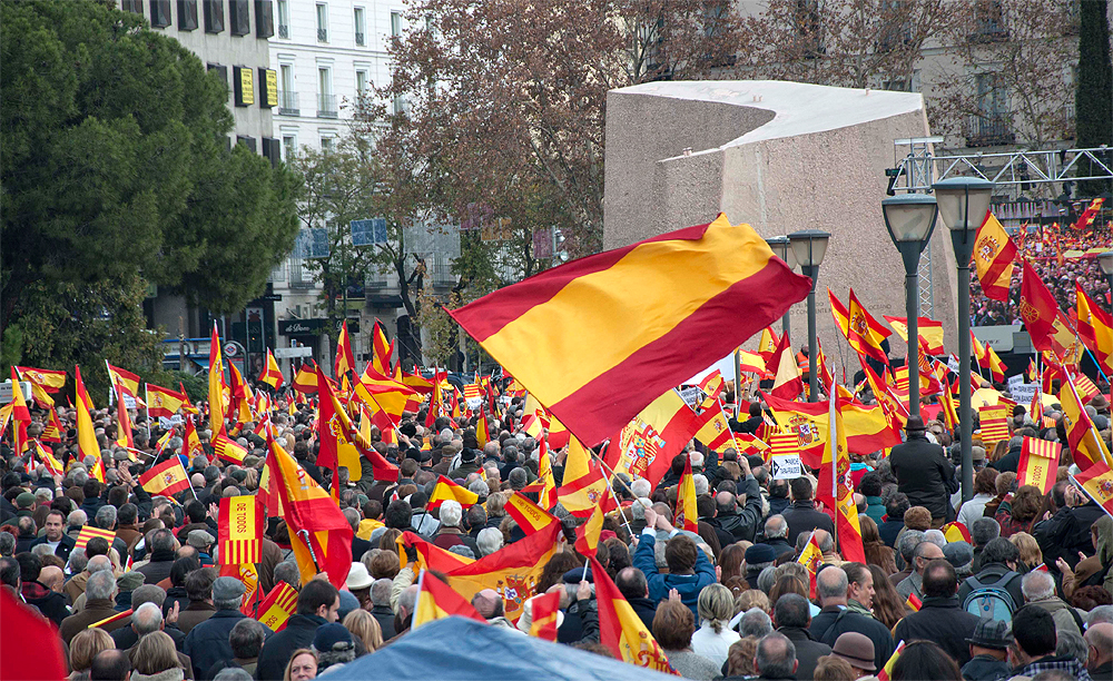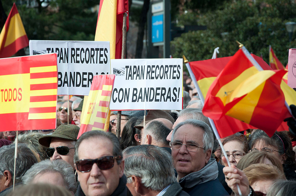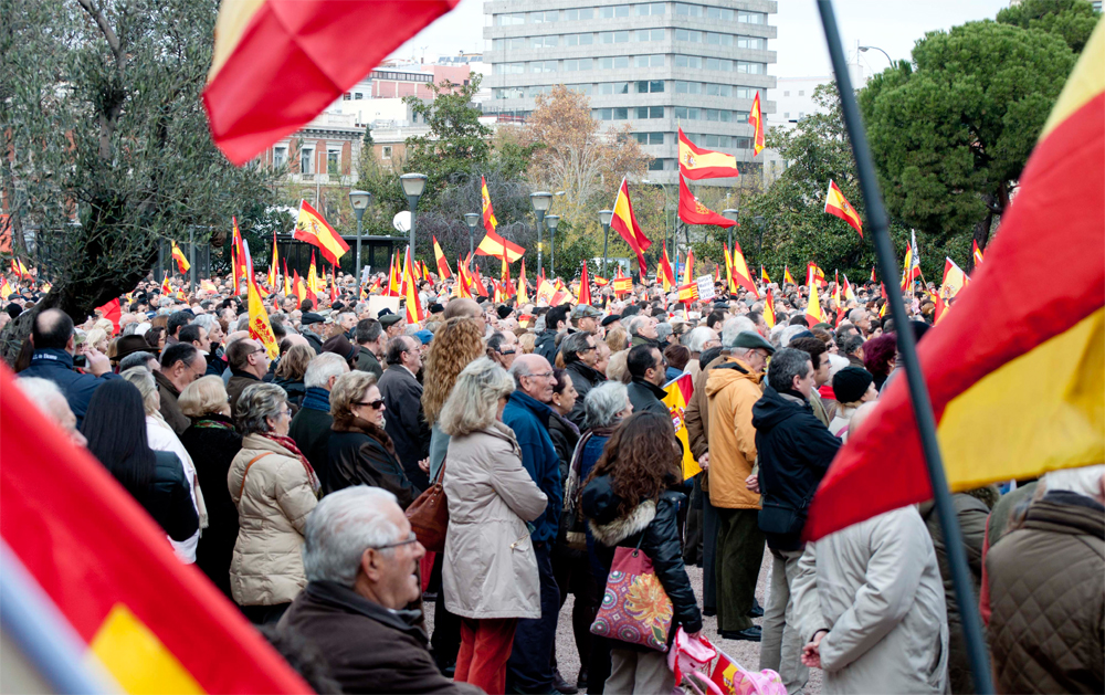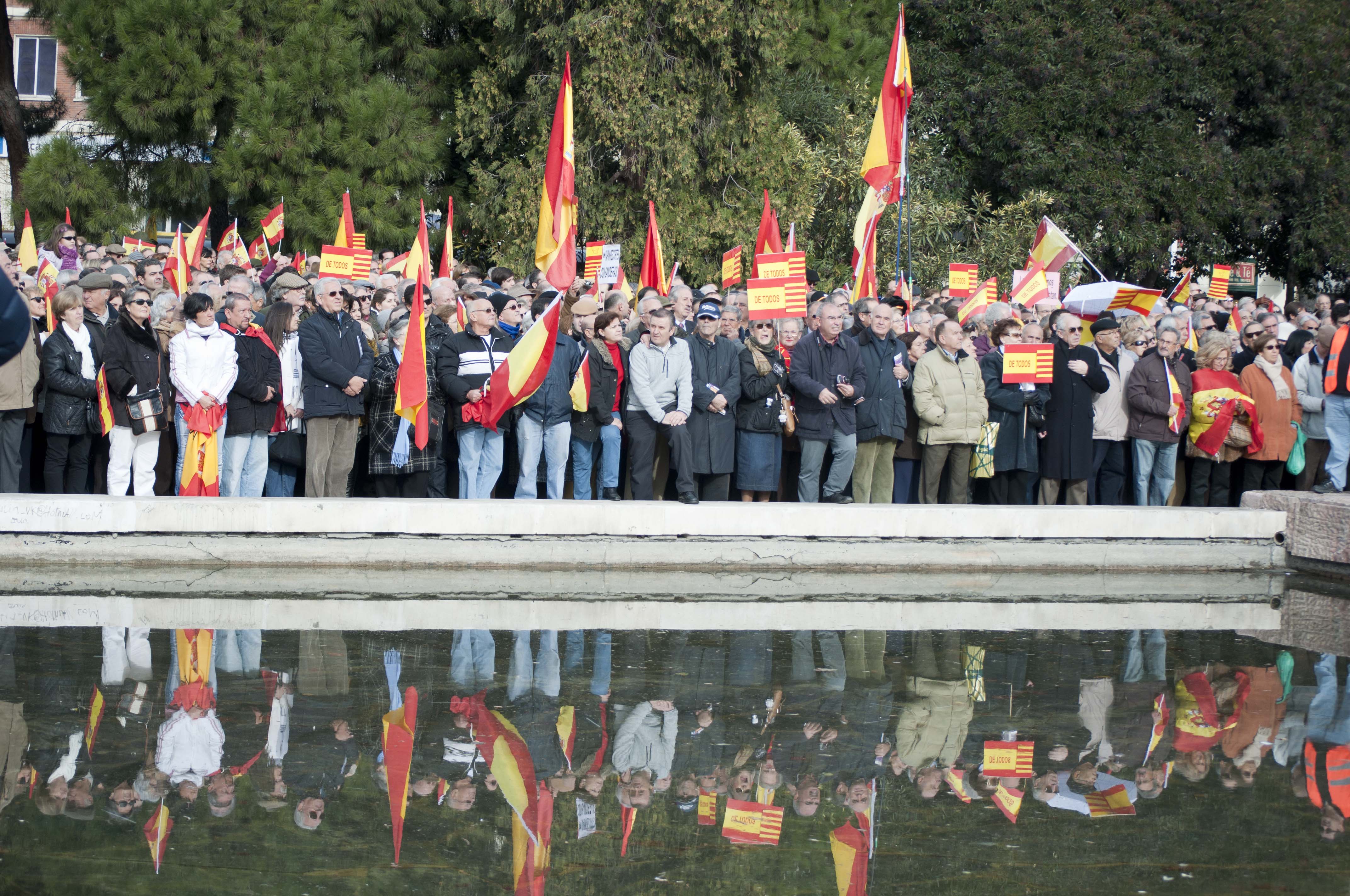 Cientos de banderas de España fueron la nota predomintante en la concentración en la Plaza de Colón en Madrid.