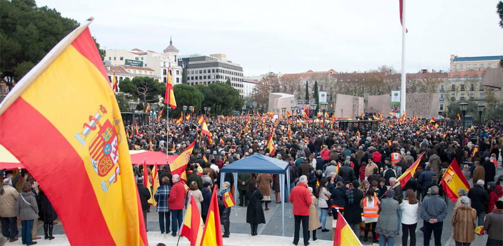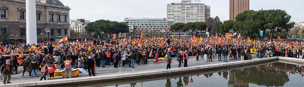 La madrileña plaza de Colón se ha llenado con miles de personas y miles de banderas de España por la unidad de la nación.