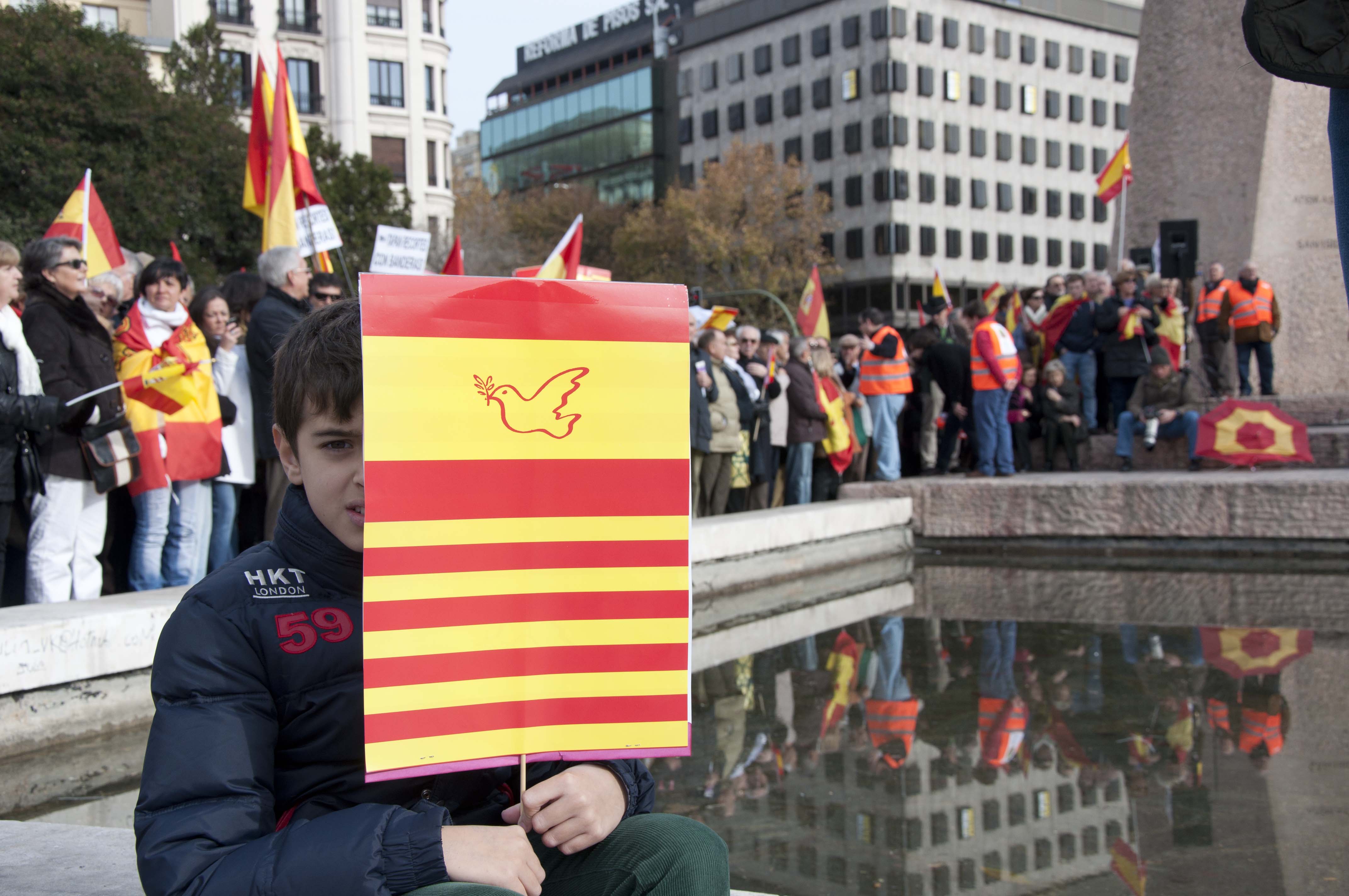 Un niño sujeta una pancarta que funde la bandera de España la de Cataluña y una paloma de la paz.