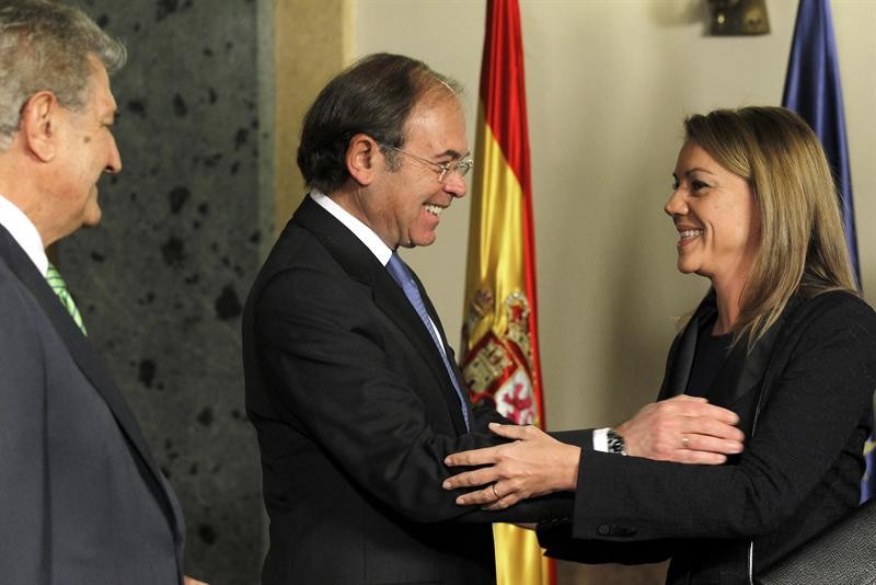 El presidente del Senado, Pío García Escudero, en presencia del presidente del Congreso, Jesús Posada, saluda a la presidenta de Castilla-La Mancha, María Dolores de Cospedal, durante el acto de celebración del Día de la Constitución que ha tenido lugar hoy en el Senado