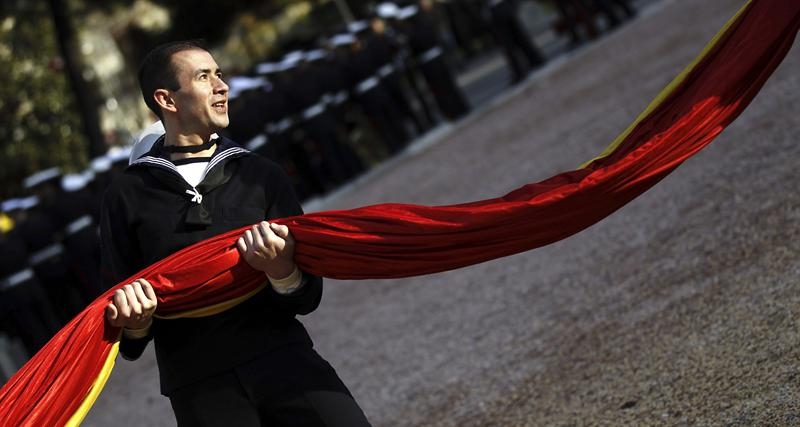Un momento del acto solemne de izado de la bandera nacional, que han realizado efectivos de la Agrupación de Infantería de Marina de Madrid