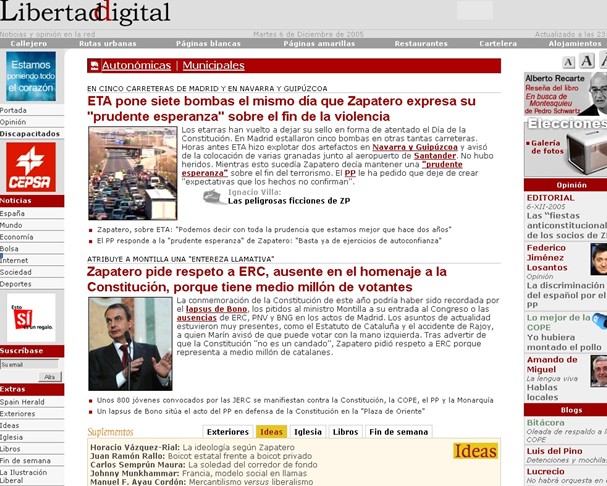 Tal día como hoy, 6 de diciembre, pero de 2005, Libertad Digital llevaba en su portada una nueva aparición de la banda terrorista ETA en el Día de la Constitución en forma de atentados múltiples y titulada: "ETA pone siete bombas el mismo día que Zapatero expresa su "prudente esperanza" sobre el fin de la violencia". En Madrid estallaron cinco bombas en otras tantas carreteras. Horas antes la banda terrorista hizo explotar dos artefactos en Navarra y Guipúzcoa y avisó de la colocación de varias granadas junto al aeropuerto de Santander.