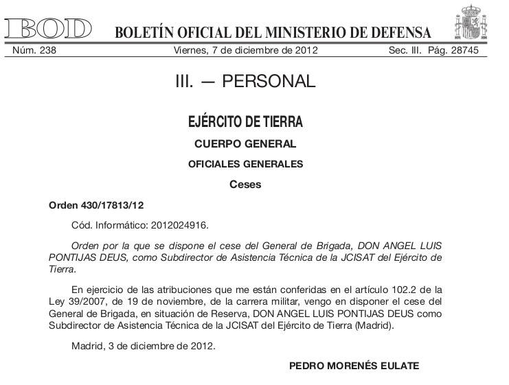 El cese del general de Brigada en la reserva Ángel Luis Pontijas ya es oficial. Así lo publica este viernes el Boletín Oficial de la Defensa, en la que se recoge la orden del ministro, Pedro Morenés, de destituir de su cargo al máximo responsable de la revista Ejército por la publicación de un editorial con valoraciones sobre las políticas del presidente de la Generalidad de Cataluña, Artur Mas.