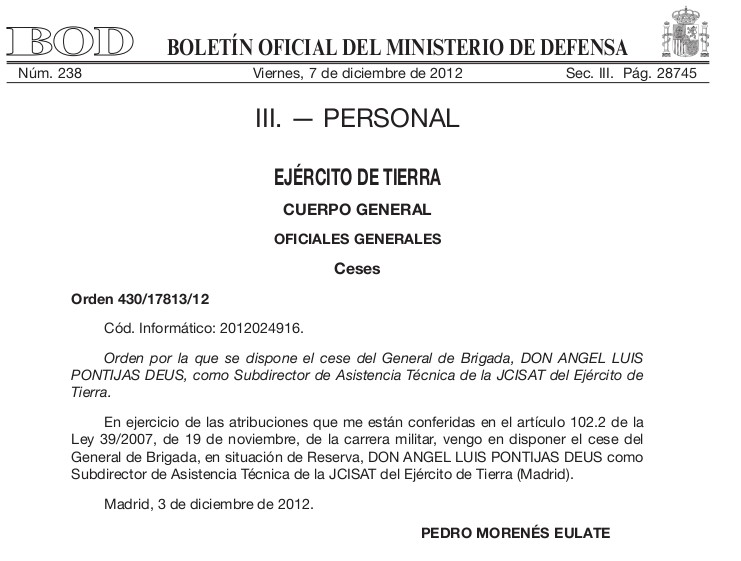 La decisión del ministerio de cesar de su cargo a Pontijas trascendió a los medios de comunicación el pasado sábado. De hecho la orden de cese por parte de Morenés fue firmada el pasado lunes día 3, y de la misma fue informada el general de Brigada en la reserva una día más tarde, cuando fue cesado de facto por Domínguez Buj en la sede del Cuartel General del Ejército.