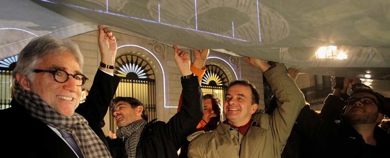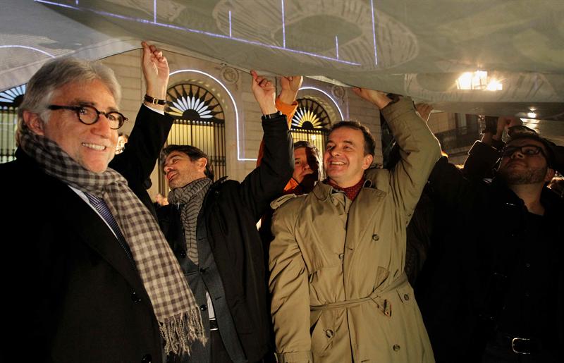 CiU se puso a la cabeza de la protesta contra la reforma educativa del Gobierno que pretende, entre otras muchas cosas, hacer cumplir en Cataluña las sentencias del TC y del TS sobre la lengua en la enseñanza. En la imagen, el diputado de CiU, Josep Sánchez Llibre, el secretario general de CDC, Oriol Pujol, y el diputado de ERC, Alfred Bosch,i-d., sujetan la pancarta esta tarde en la plaza San Jaime de Barcelona