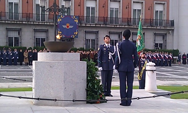 El acto comenzó con los acordes del himno nacional, tras lo que se pasó revista a la formación, que estaba situada a uno de los lados del caza C101 –que usa la popular Patrulla Águila– que hace de monumento en el centro de la plaza y que el propio Ejército del Aire entregó como regalo el pasado mes de mayo a la ciudad de Madrid.