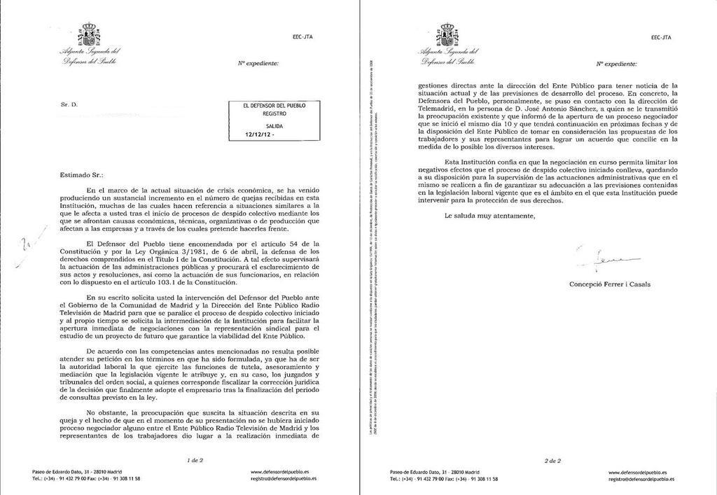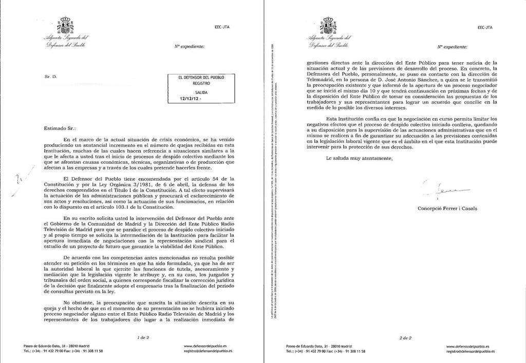 No obstante, la misma misiva explica que, eso sí, la propia Defensora se ha puesto en contacto con la dirección de Telemadrid y que desde ésta le han explicado que ya se ha abierto un proceso de negociación, así que la institución "confía en que la negociación en curso permita limitar los negativos efectos" del proceso en curso en la televisión autonómica madrileña.