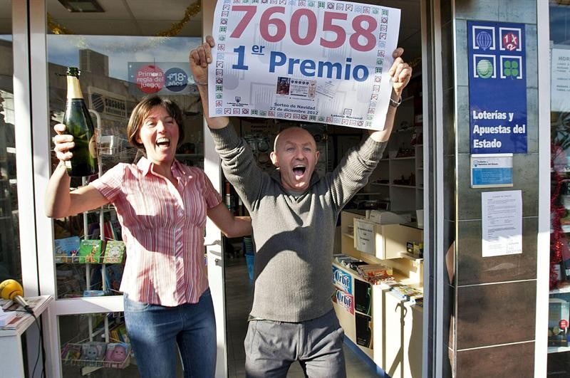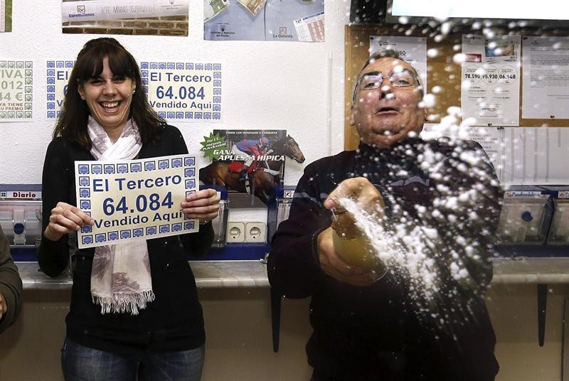 Maria de los Santos Abad (c), dueña del despacho receptor 36.095 de la calle Doctor Barraquer, en Albolote (Granada), celebra con vecinos la venta de uno de los tres décimos del gordo de Navidad, que han repartido 1,2 millones de euros en las localidades granadinas de Cúllar, Almuñecar y Albolote.