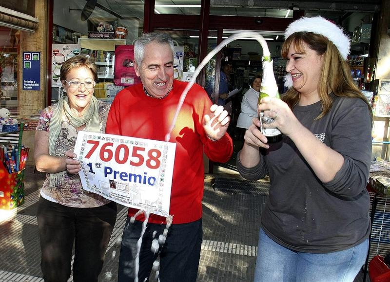 Varios agraciados celebran el premio 'Gordo' de la Navidad en la localidad vizcaína de Derio.