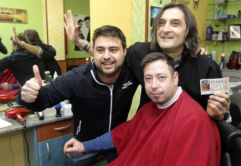 Unos clientes de la peluquería Miguel Ángel, de Zaragoza, y el propio peluquero (d), muestran el décimo con el número 22.343 premiado con uno de los quintos premios del Sorteo Extraordinario de Navidad, repartido entre los clientes.
