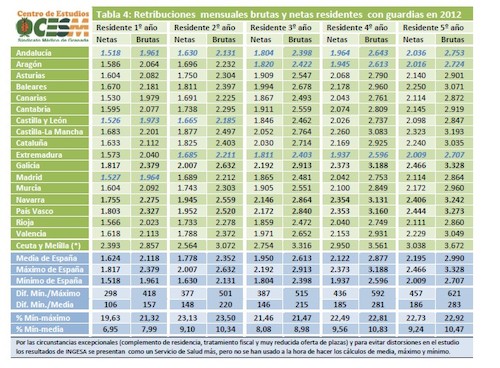 Según el análisis comparativo realizado por el Centro de Estudios del Sindicato Médico de Granada, las diferencias entre CCAA llegan hasta los 399 euros brutos al mes y los últimos lugares los ocupan Andalucía, Cantabria, Castilla León y Cataluña. Es el resultado del Estudio de Retribuciones de los Residentes en España en 2012 y recortes desde 2009