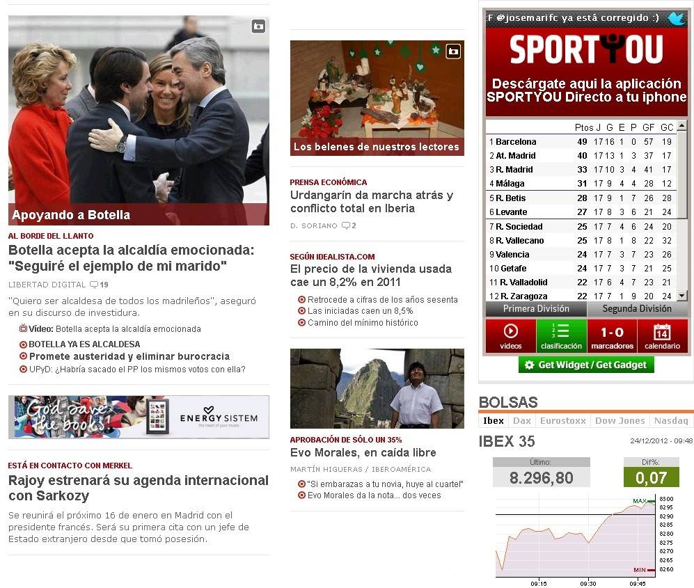 Tal día como hoy, 27 de diciembre, pero de 2011, Libertad Digital contaba en su portada el relevo en la alcaldía de Madrid tras la salida de Gallardón para entrar en el Gobierno de Rajoy. Titulaba: "Botella acepta la alcaldía emocionada: "Seguiré el ejemplo de mi marido".