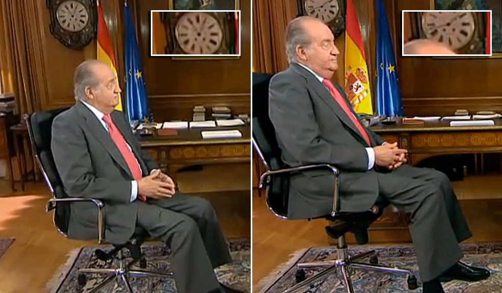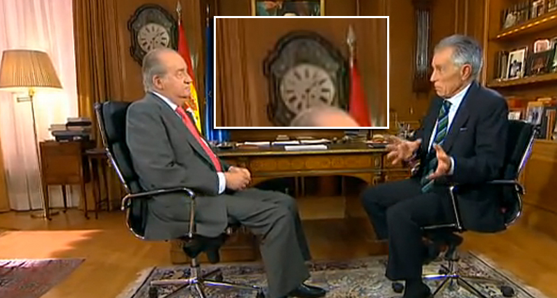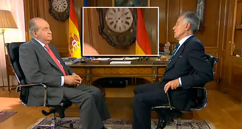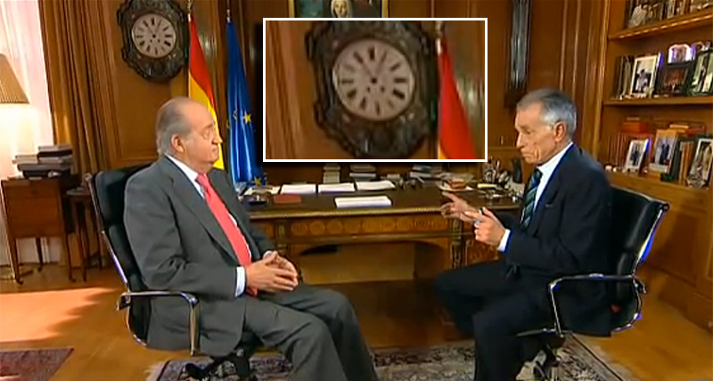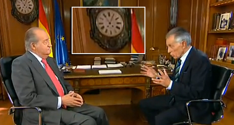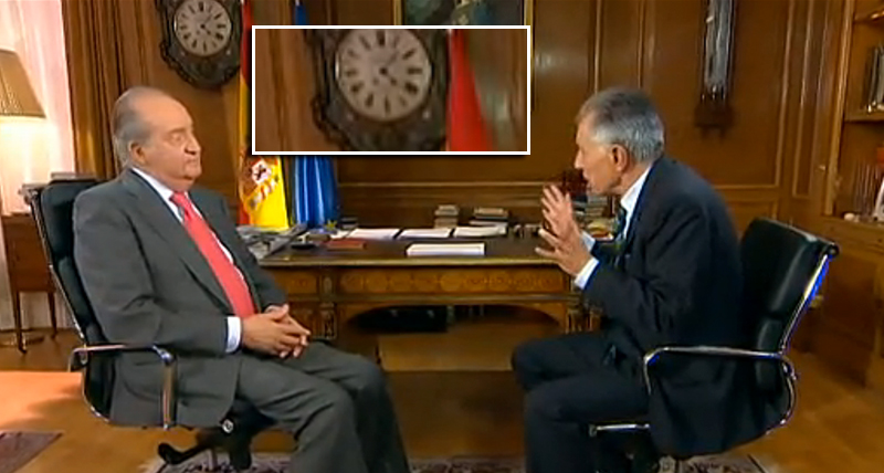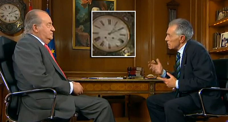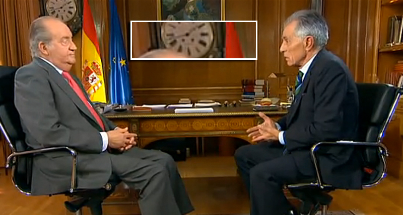 Hacia el minuto 5 de la entrevista, la hora marcada en el reloj ya no encaja. Jesús Hermida le pregunta al Rey si se puede hablar también de insatisfacciones en su reinado. A lo que el Rey responde aludiendo a las víctimas de ETA. La hora señalada, las 13.10.