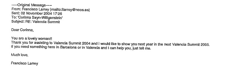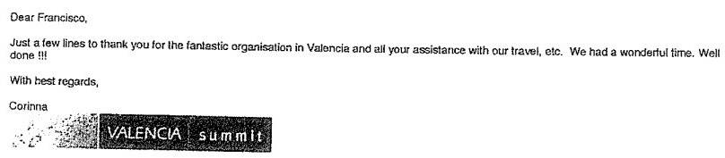 "Querida Corinna, ¡Eres una mujer encantadora!. Gracias por venir a Valencia Summit 2004 y me gustaría enseñarte el próximo Valencia Summit 2005. Si necesitas cualquier cosa aquí Barcelona o en Valencia y puedo ayudar, dímelo. Con mucho cariño".