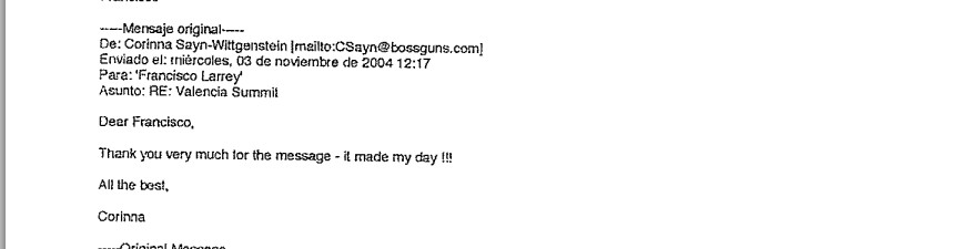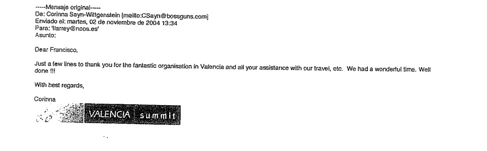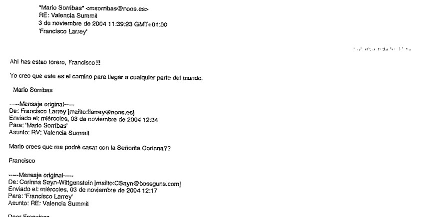En el primero de los e-mails, con fecha de 2 noviembre de 2004, es un correo de Corinna -enviado desde una dirección de la empresa de armas Boss Guns- a Francisco Larrey, empleado de Nóos.