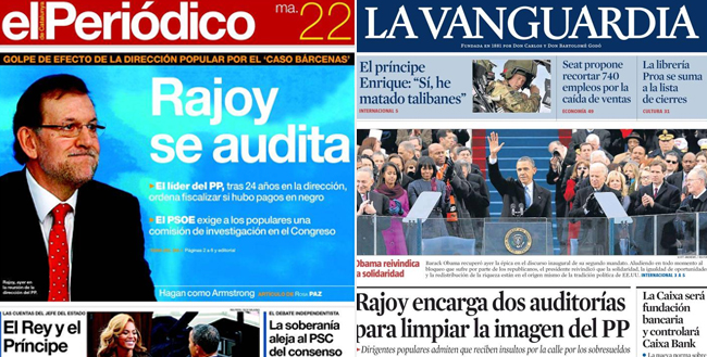 El escándalo Bárcenas lleva días acaparando las portadas de la prensa. Este martes, tras el Comité Ejecutivo de Rajoy, su anuncio de una investigación y los últimos detalles sobre las cuentas del extesorero, vuelven a las primeras páginas, incluidas las de los diarios catalanes La Vanguardia y El Periódico, que destacan las medidas del presidente del PP con grandes caracteres.