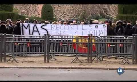 Agentes de los Mossos d'Esquadra han realizado frente al Parlamento catalán una protesta en contra de los recortes utilizando el castellano y luciendo dos banderas españolas.