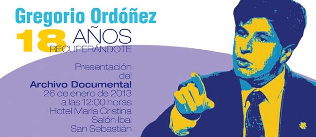 Este sábado, la Fundación que lleva su nombre, Gregorio Ordóñez, presenta en San Sebastián el archivo documental en memoria de Gregorio en un acto titulado "Gregorio Ordóñez, 18 años Recuperándote", un trabajo de recopilación de su vida política.
